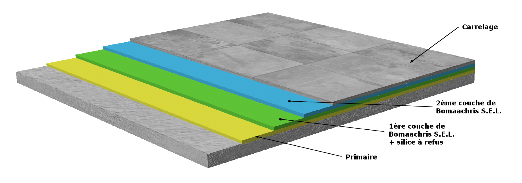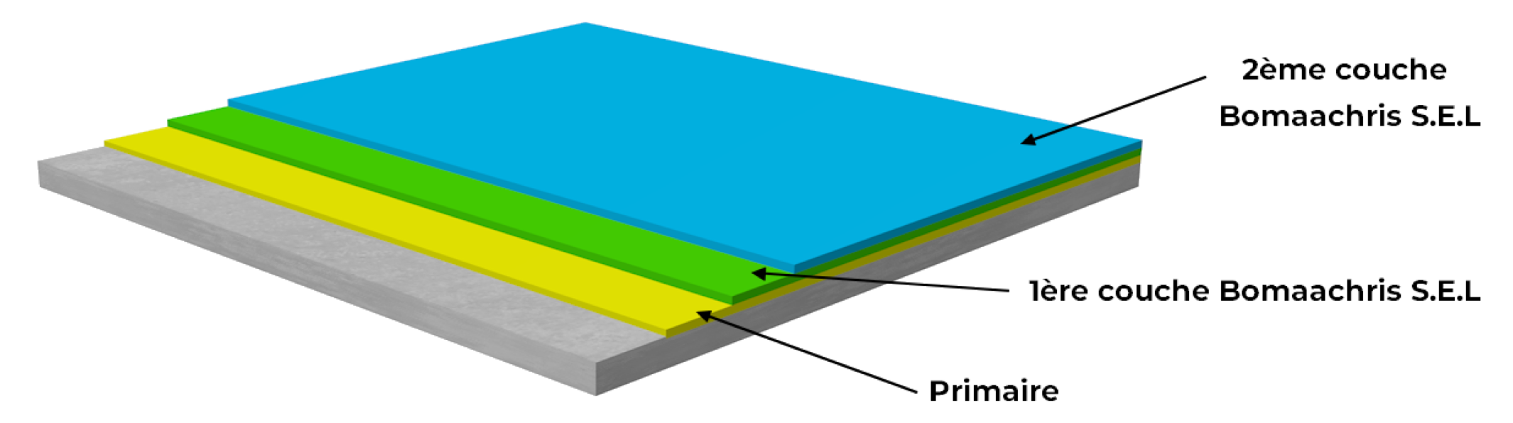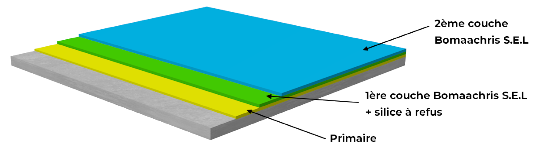 - Première couche + silice à refus. Appliquez une première couche de Bomaachris S.E.L.